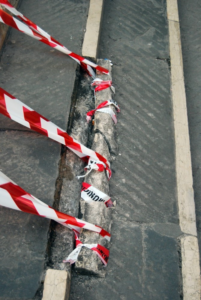 Pur essendo fatti di un materiale resistente essi sono soggetti quotidianamente all'usura derivata dal transito dei pedoni e dagli urti dei già menzionati carrelli/trolley. Talvolta si verificano quindi delle rotture dei gradini, e le foto di questo post ne vogliono documentare una. Tale spaccatura si è registrata sul Ponte di Rialto qualche tempo fa. Si è reso necessario un intervento di sostituzione che è costato alla collettività circa 300 euro (vedi terza foto). Il gradino in questione si è in pratica sbriciolato rendendo impossibile il suo recupero. Purtroppo non vi sarebbe che una soluzione praticabile: vietare sui ponti di Venezia il transito di carrelli da trasporto e di valige con le rotelle. Credo però che non si potrebbero tenere sotto controllo tutti i ponti della città. Come sempre invece andrebbero applicate delle regole di buon senso. Troppe volte abbiamo visto sbattere i carrelli da trasporto sui ponti. E poi alcuni di essi non hanno nemmeno le rotelle davanti. Se tutti noi trattassimo con un po' più di gentilezza i ponti, "accompagnando" senza sbattere sui gradini i nostri trolley, probabilmente eviteremmo il ripetersi di problemi come quelli documentati. Intanto però un altro carrello da trasporto passa a pochi metri dal gradino appena sostituito sul Ponte di Rialto (vedi ultima foto).